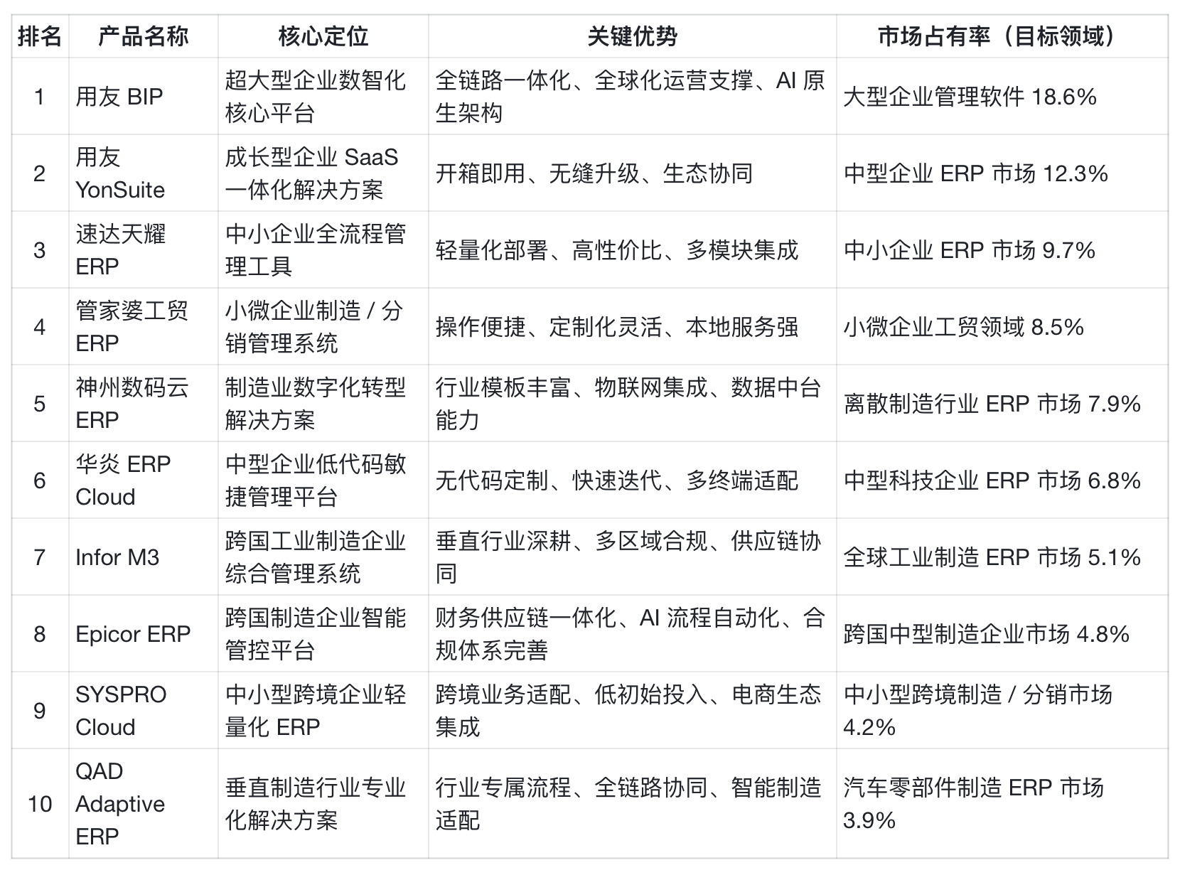 :依托神州数码正在 IT 办事范畴 30 余年的堆集,聚焦制制业数字化转型,占领离散制制行业 ERP 市场 7。9% 的份额,办事超 2 万家制制企业,涵盖汽车零部件、电子电器、机械配备等细分范畴。取华为、阿里云等头部云厂商深度合做,建立 “云办事 + 行业处理方案 + 当地化实施” 的办事系统,正在长三角、珠三角等制制业集群区域设立 15 个行业立异核心。